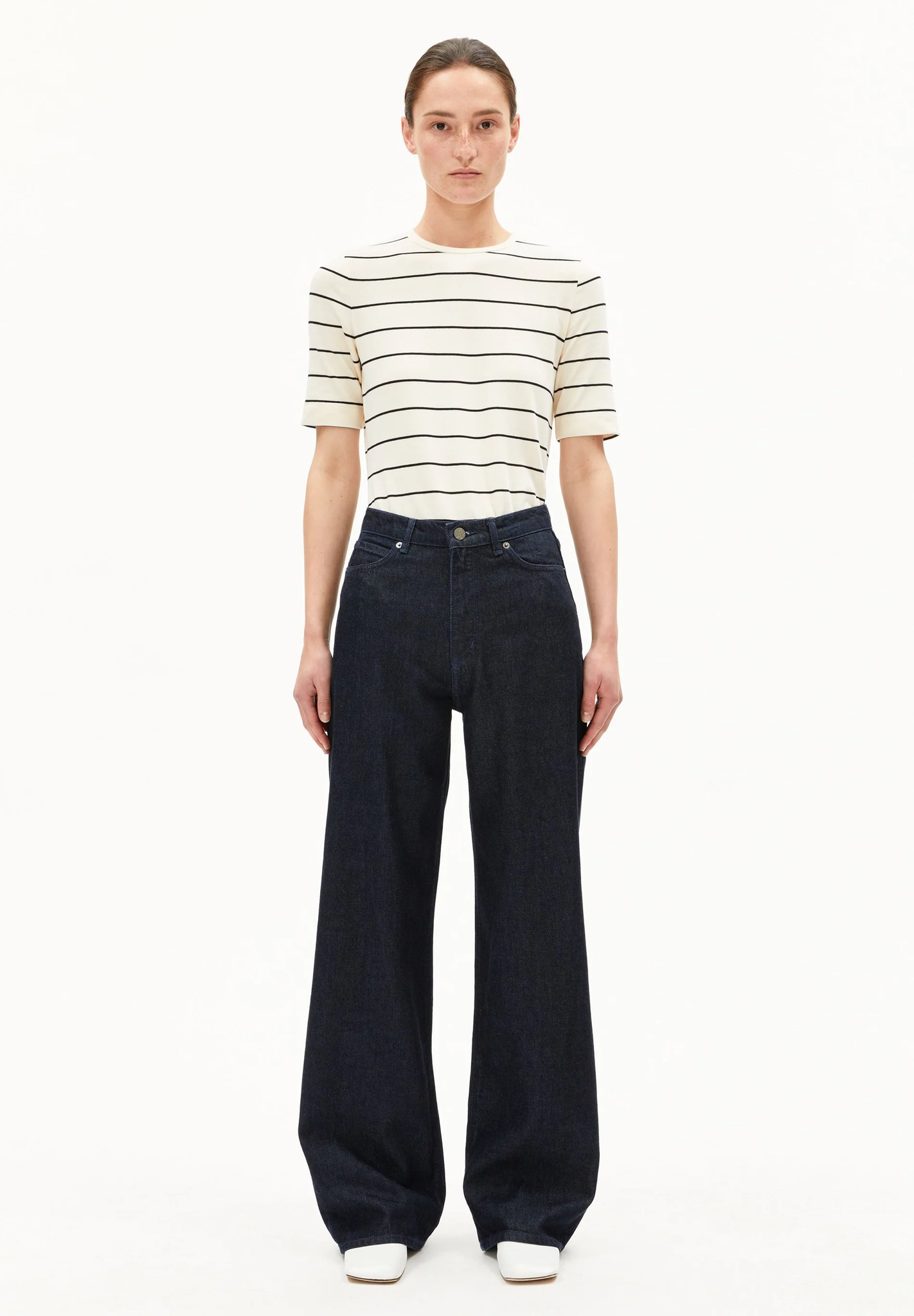 Armed Angels sizes are true to size. For reference, model Song W is 177cm tall and wears size 27/32. The regular fit and wide leg create a flattering silhouette that enhances the waist and elongates the legs.